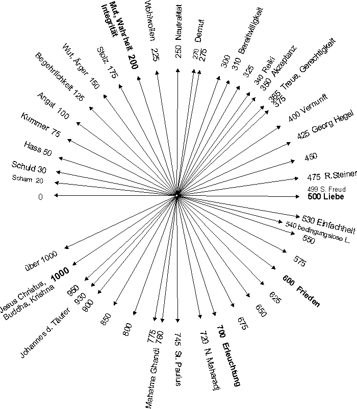 Da ich auch gerne und erfolgreich mit Pendel und Wünschelrute arbeite, überprüfe ich immer vor und nach einer Behandlung die Bewusstseinsebene des Heilsuchenden z.B. mit dem Pendel auf so einer Tafel wie oben abgebildet. Bemerkenswert ist, dass jeder, der emotionale Verhaltensmuster loslässt, auf der Bewusstseins Ebene (individuell unterschiedlich) 50 bis 150 Punkte aufsteigt. Das ist enorm!!